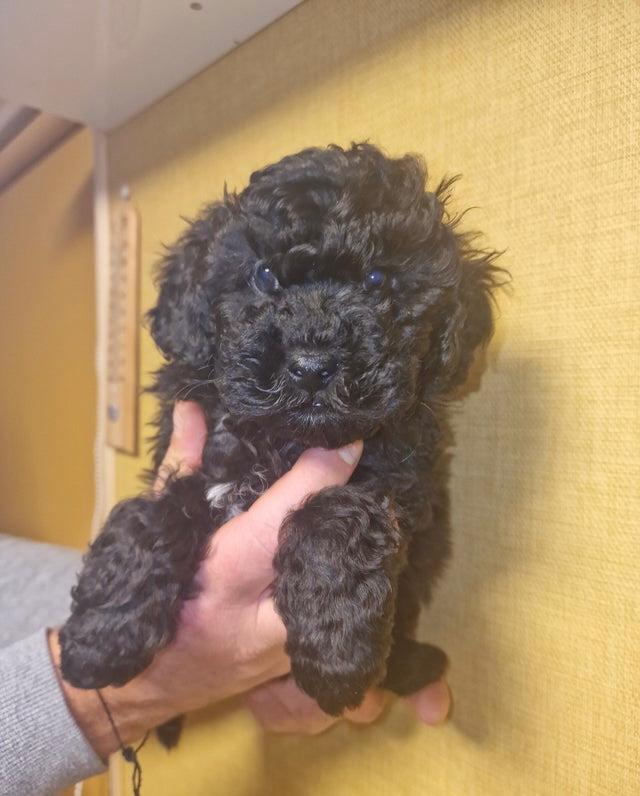 Black Maltipoo puppy with curly coat & big eyes – fluffy & hypoallergenic! Health-tested. Maltipoo for sale – reserve today!