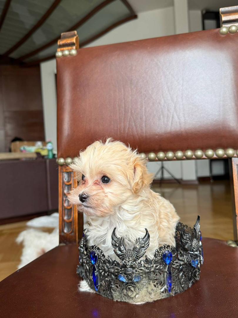 Our precious apricot Maltipoo puppy is ruling from her adorable crown-shaped pet bed – look at those soulful eyes, curly apricot coat, and tiny paws peeking out! This little queen has the classic Maltipoo teddy-bear look: soft low-shedding curls, hypoallergenic-friendly coat, and a gentle, playful personality.