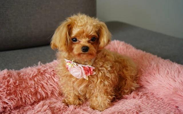 Adorable apricot Maltipoo puppy with pink floral bow – fluffy, hypoallergenic, loving! Health-tested & ready. Maltipoo for sale – reserve now!